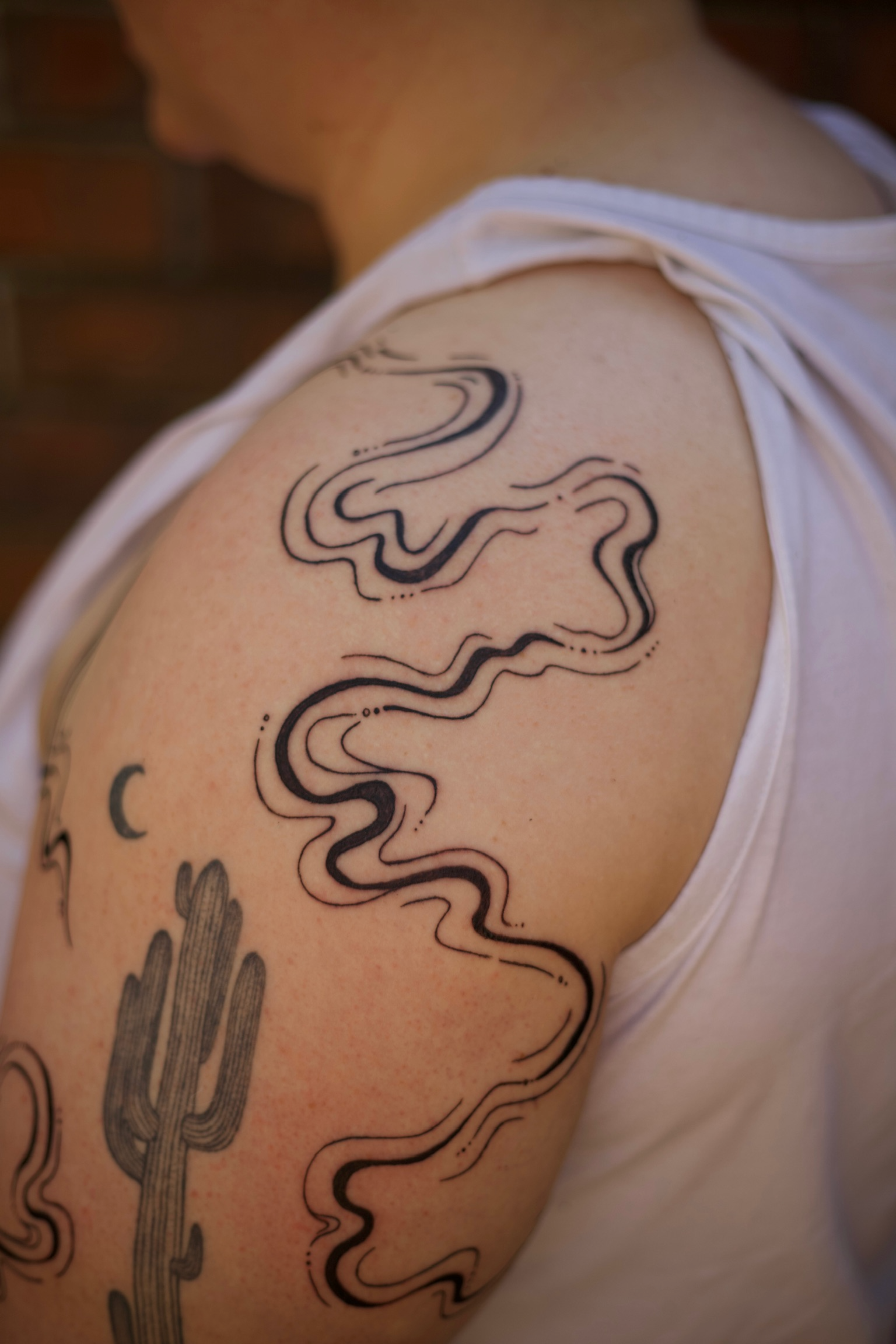 By “freehanding” (i.e., not using a pre-dawn design) the stencil directly onto your skin with sharpie, these tattoos are able to really flow with the shape of your body and are totally custom to you.